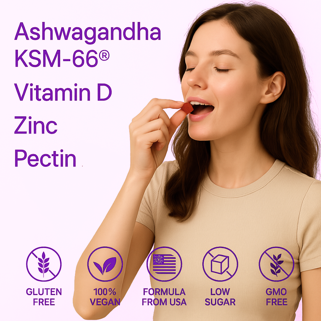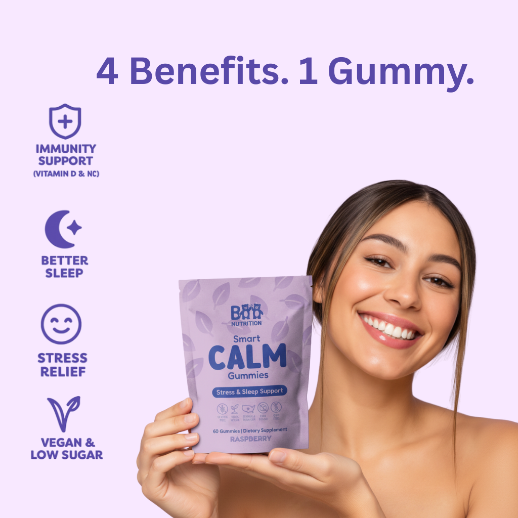 Smart Calm Gummies combine Ashwagandha and L-Theanine to help calm stress, while Vitamin D and Zinc support immunity and overall wellness. Together, they promote relaxation, better sleep, and balance.